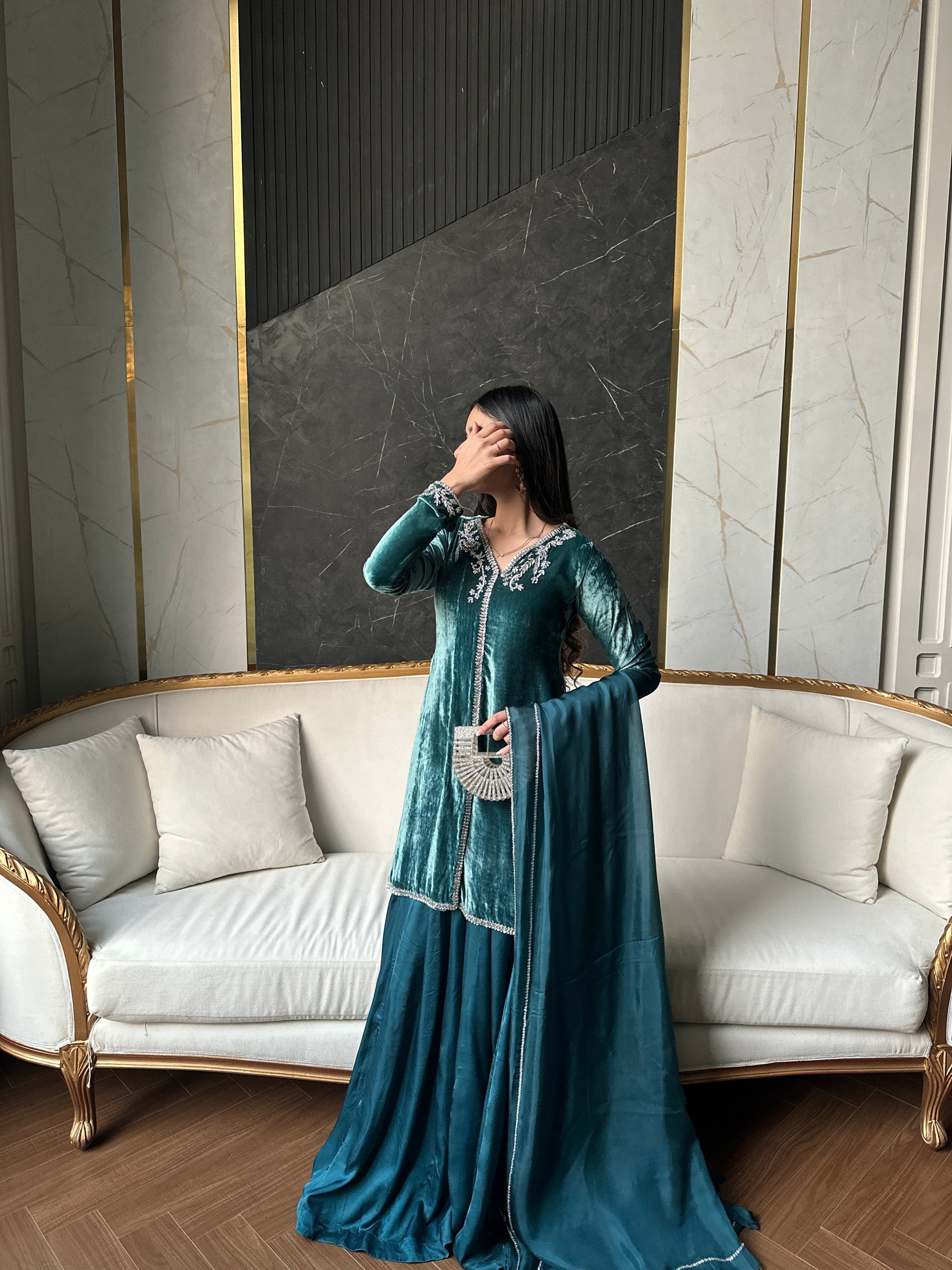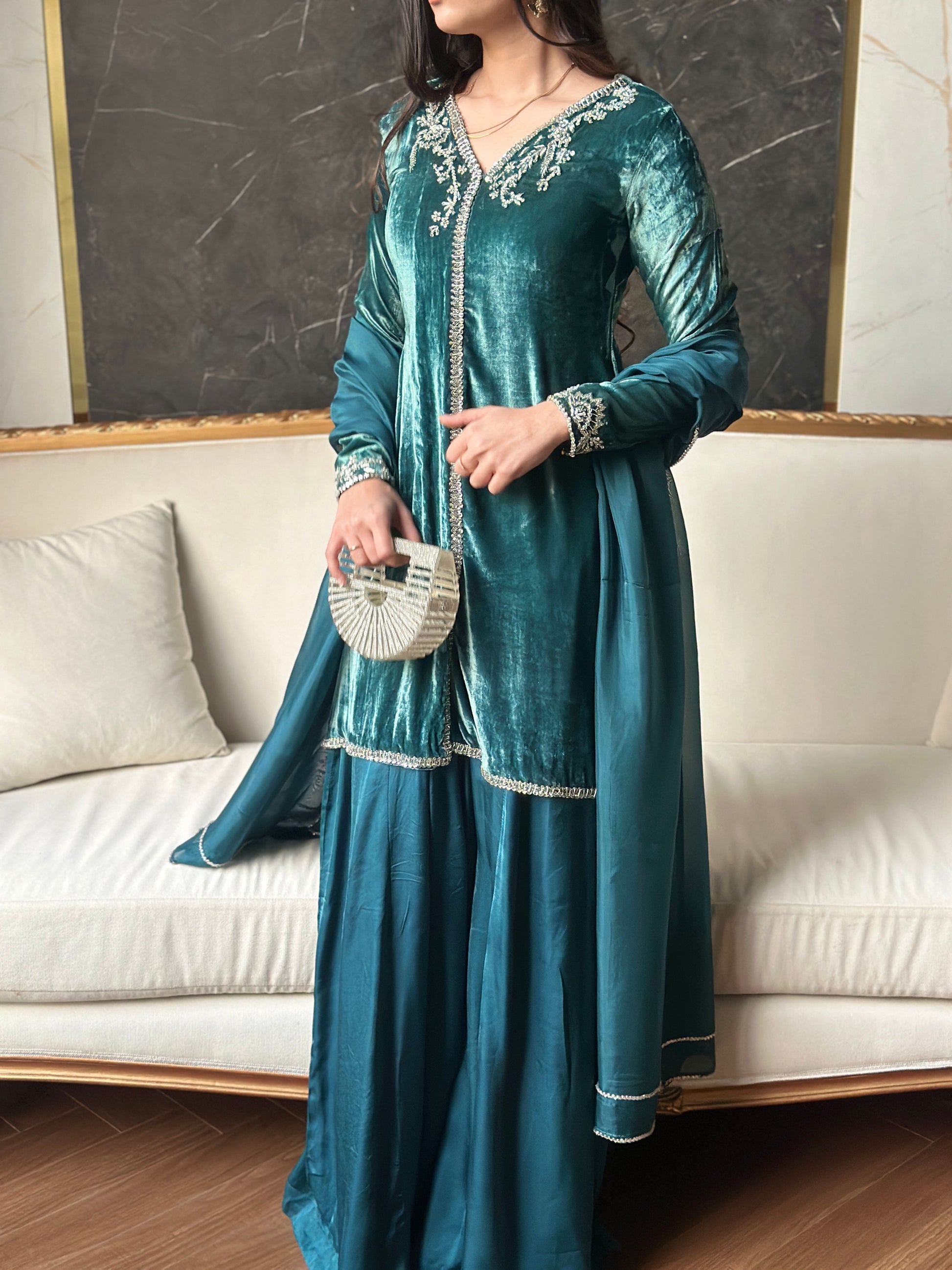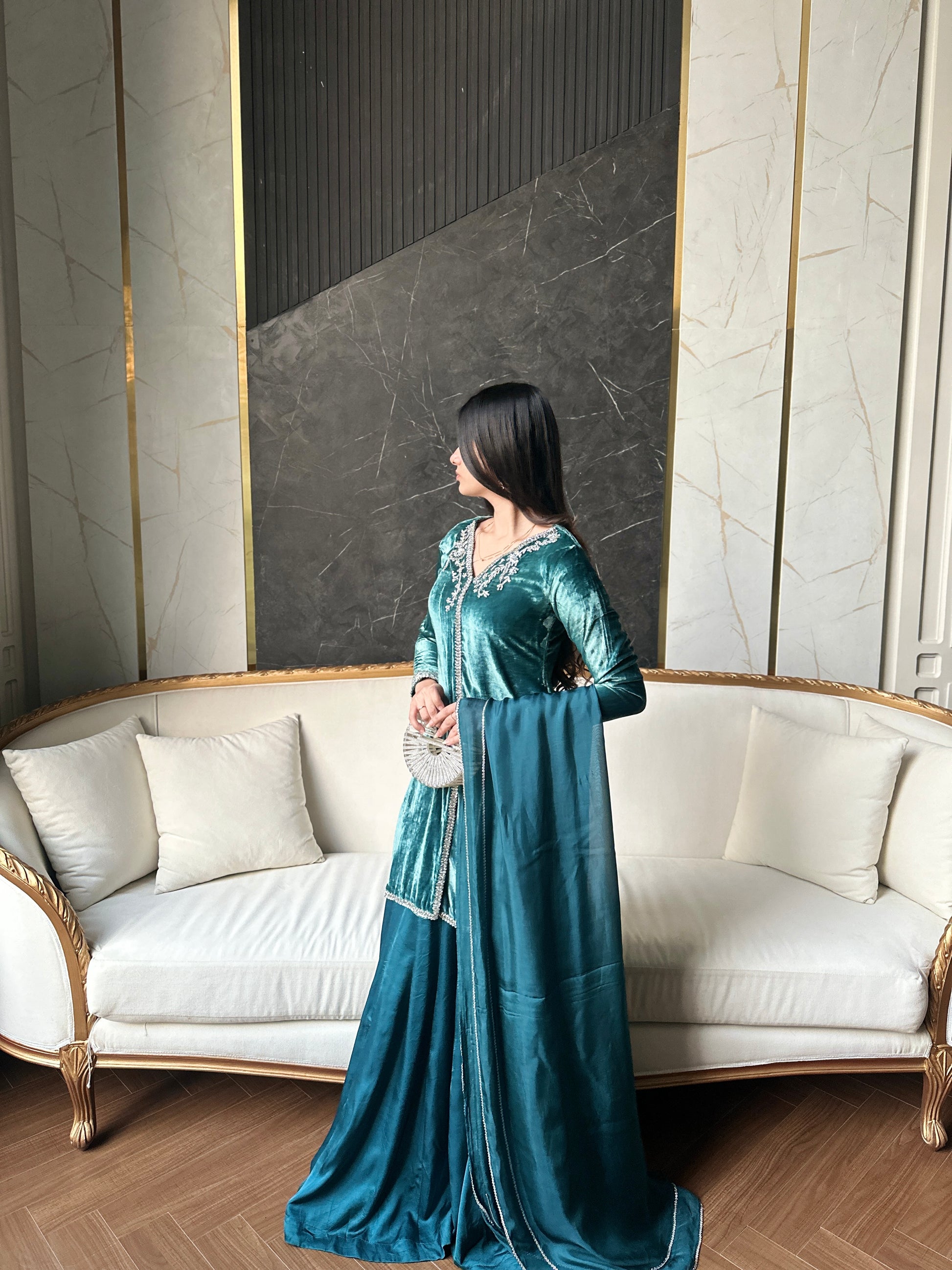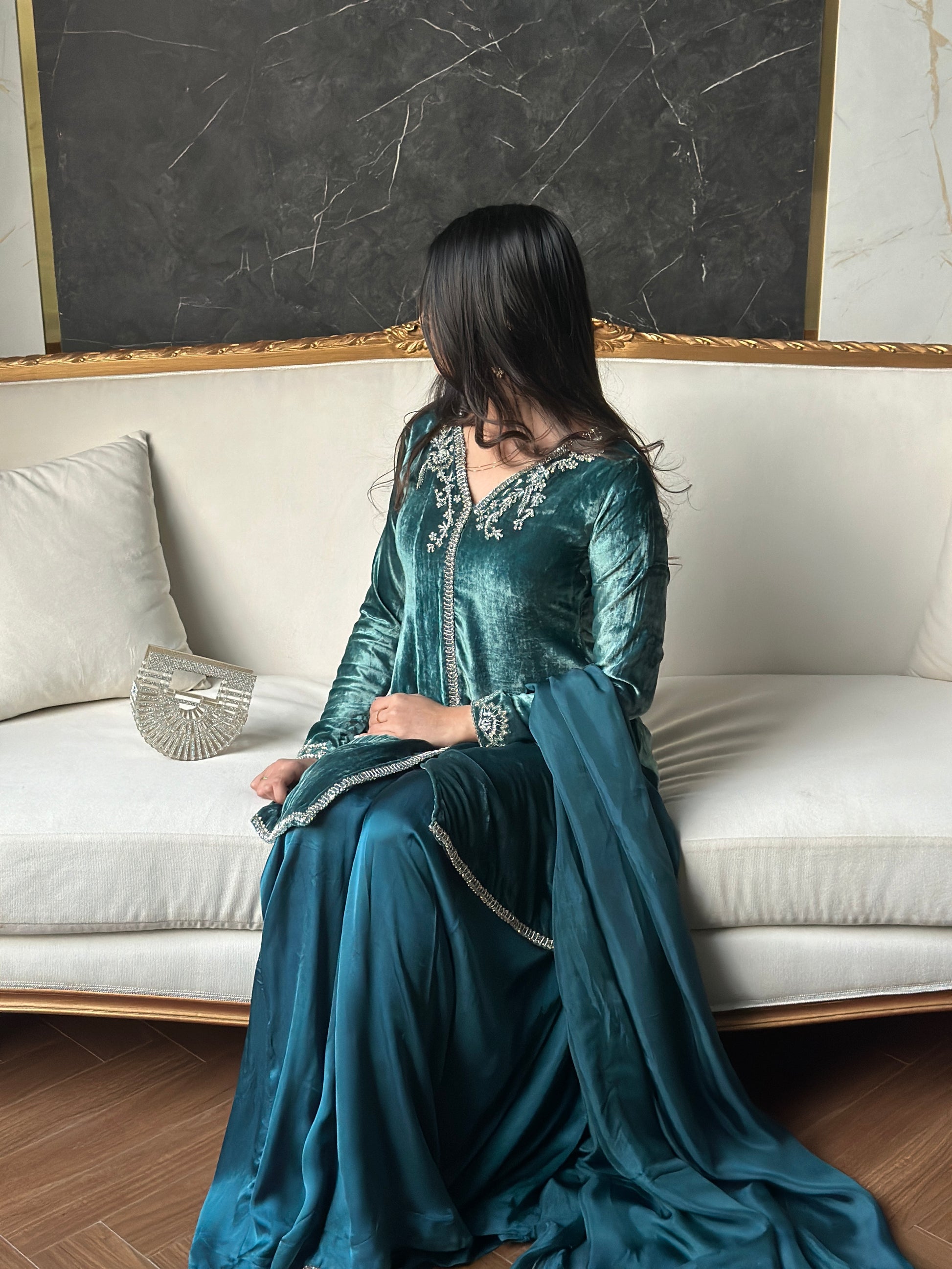fabric: french velvet with medium silk dyed dupatta and rayyan silk bottom