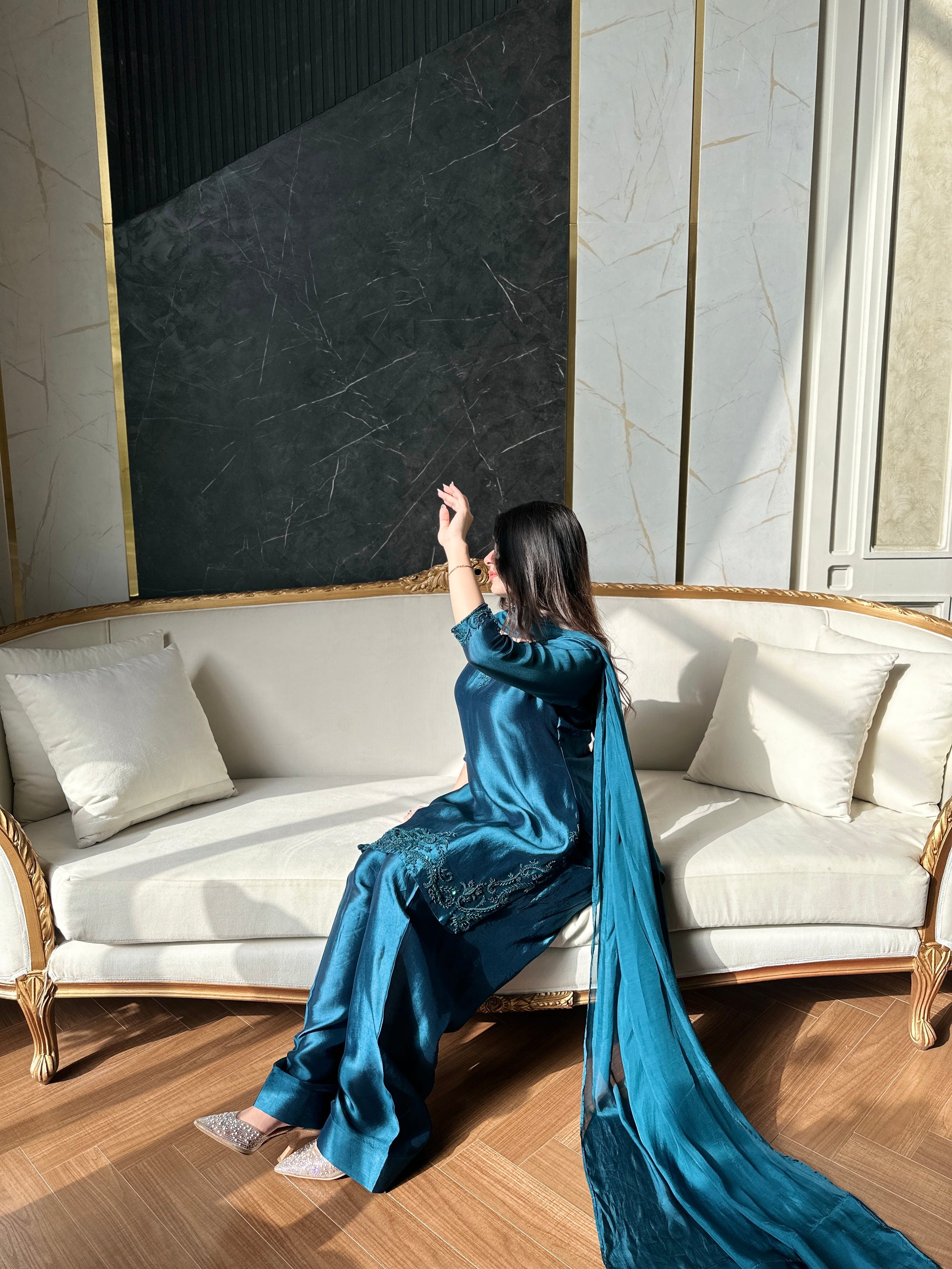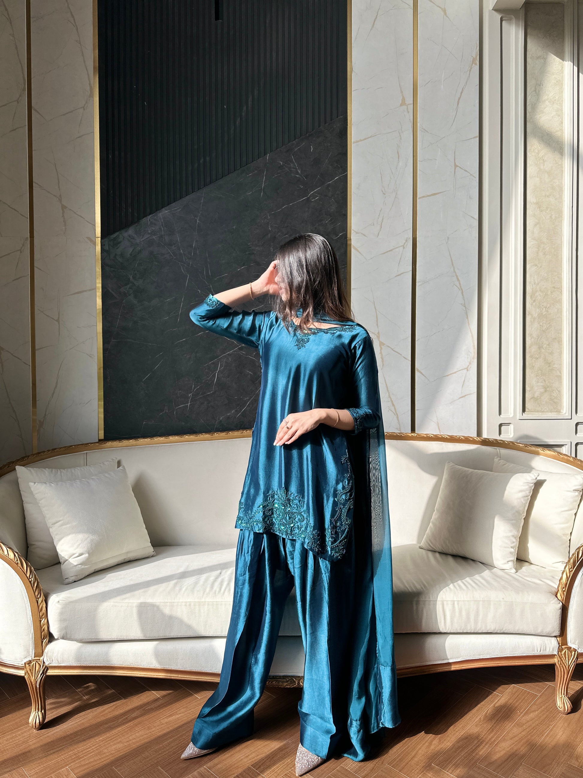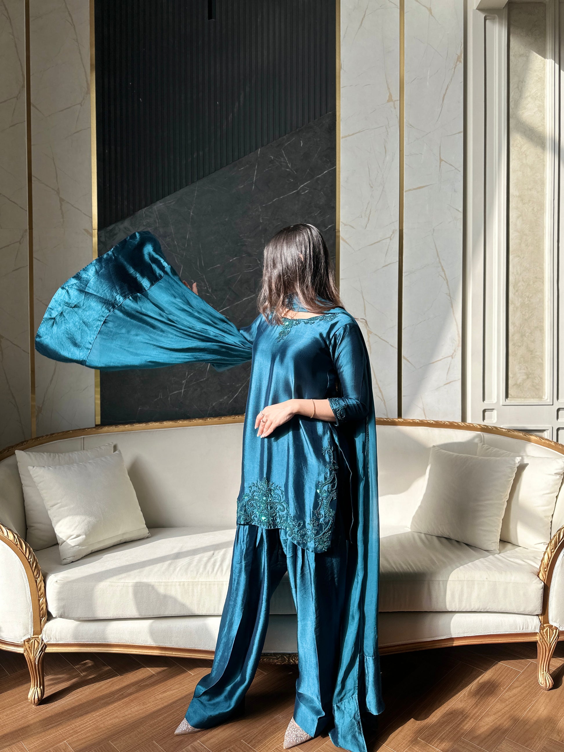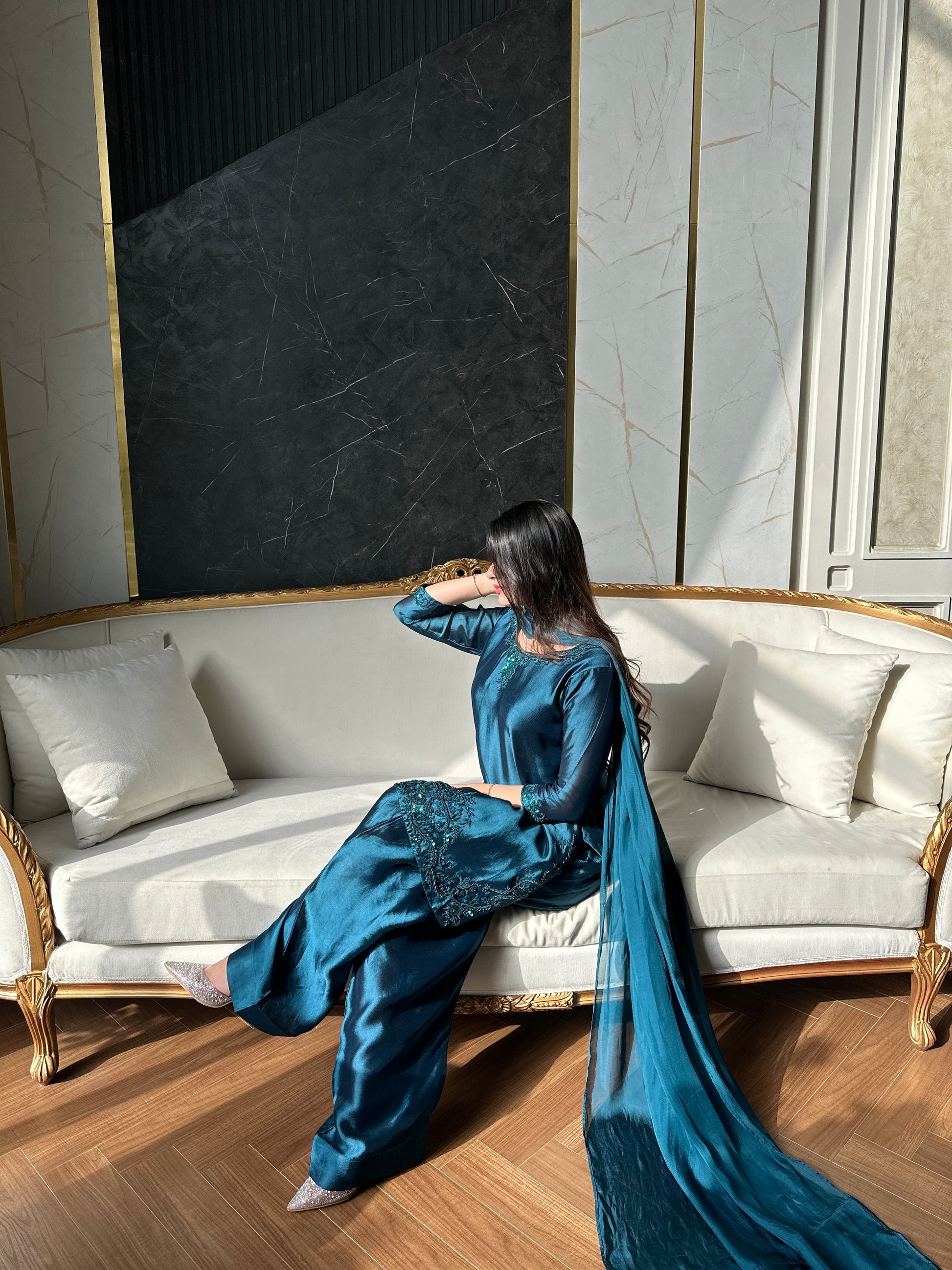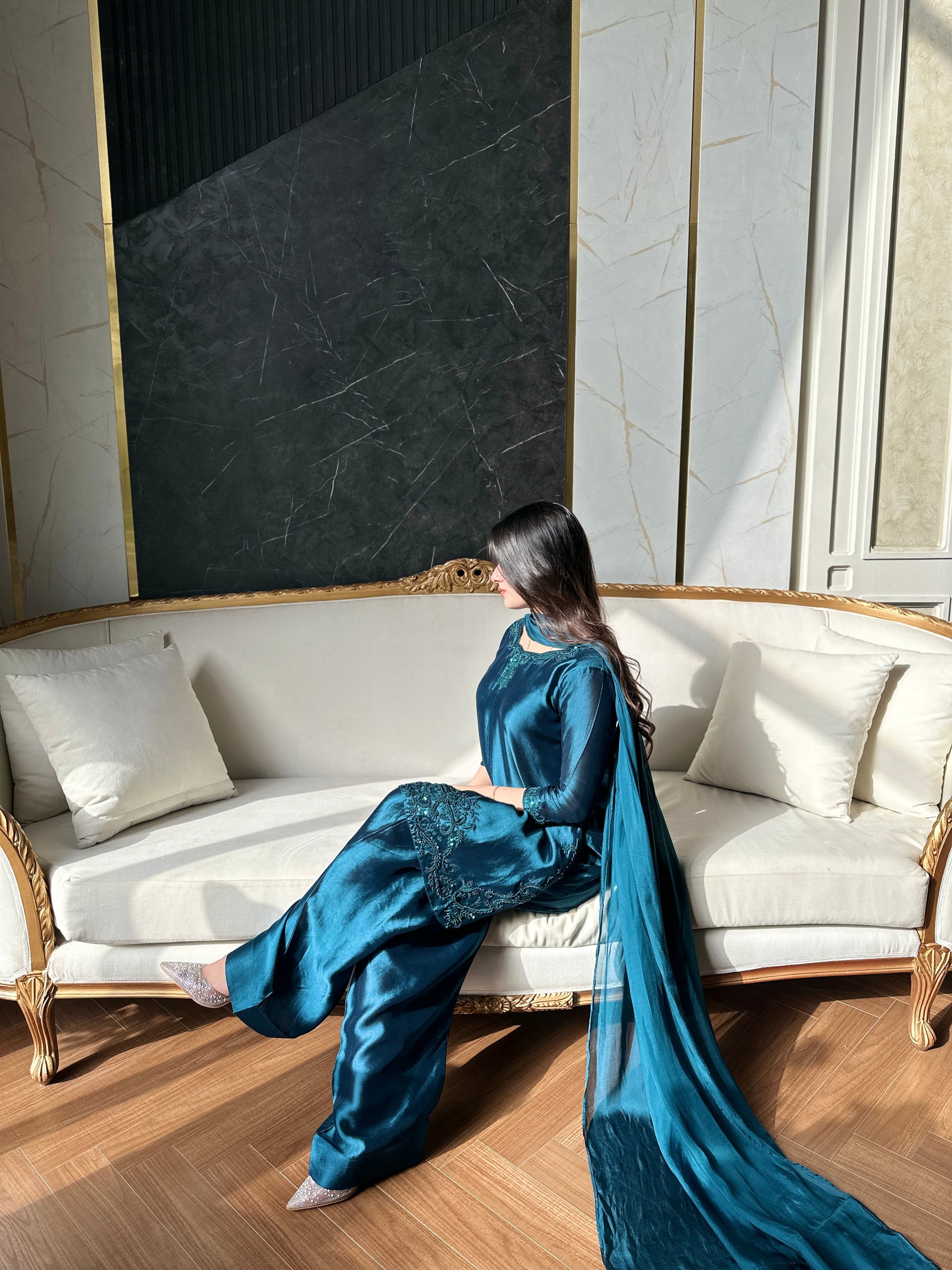 3 pc stitch article made on pure sheesha fabric with medium silk dupatta